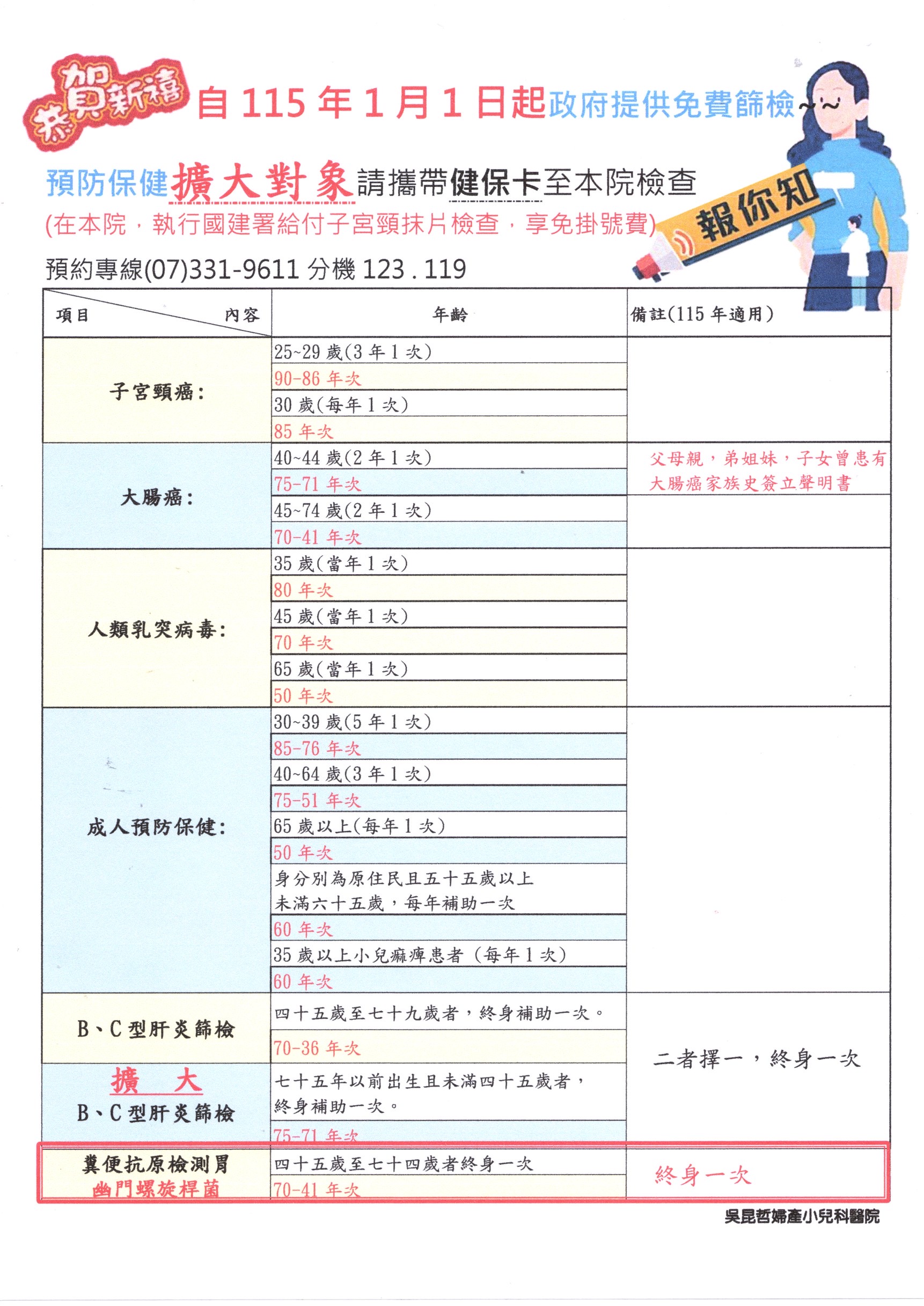 賀!本院通過107年醫院評鑑本院榮獲母嬰親善醫院     本院服務電話:07-3319611~歡迎多加利用。     禁止任何網際網路服務業者轉錄其網路資訊之內容供人點閱。但以網路搜尋或超連結方式,進入醫療機構之網址(域)直接點閱者,不在此限。     自107年4月1日起,自費新生兒照護費1500元/天     依據高市鎮衛字第10770524900文號 自107年11月3日起原定每週二及週五施打卡介苗時間更改為每週五 10:00-11:30施打。           112年10月1日(請恕以政府公告為準)公費四價流感疫苗接種          自111年2月1日起,新生兒聽力檢查時段為每週三及每週六早上09:00-10:30     目前莫德納第二劑專診開放對象為『第1至3類及孕婦距接種第一劑間隔滿28天以上』,預約民眾於接種當日務必攜帶足以識別身分證明文件。               愛的叮嚀,因應covid-19 疫情升溫,請恕暫停室內課程活動(5/15~6/8)。                                    凡至公共場所及進入院區也敬請配合防疫措施,全面配合實名登記,全程戴口罩,手部衛生,維持安全社交距離 。     本院加強公共區域~漂白水擦拭及紫外線防疫消毒     進出本醫療機構請務必配戴口罩,並配合量體溫及手部消毒~     因應新冠肺炎病毒(COVID-19)疫情,請進出醫院時務必戴上口罩,記得勤洗手          自108年8月1日起,兒科預防針接種每週一至週日施打常規疫苗時間09:00-12:00                                         卡介苗週五9:30-11:00 施打對象0~5歲     即日起,本院配合施打符合公費『人類乳突病毒疫苗(HPV)二價』對象。     菸害防治法重點議題宣導     109年9月21日(一)上午9時21分【109年國家防災日演習】臨震應變「趴下、掩護、穩住」